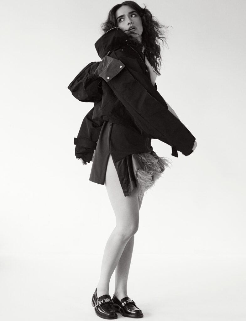 Jacket, feather-trimmed dress, & loafer: Toga