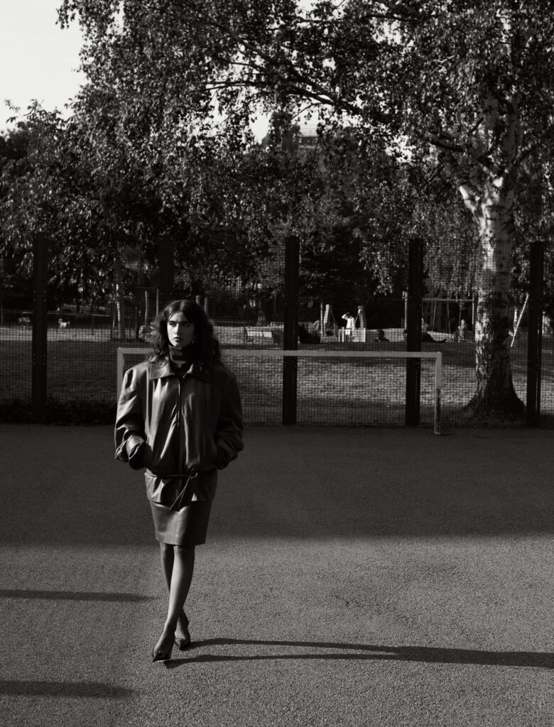 Leather jacket, leather skirt, polo top, earrings, gloves, tights & heels: Saint Laurent F25