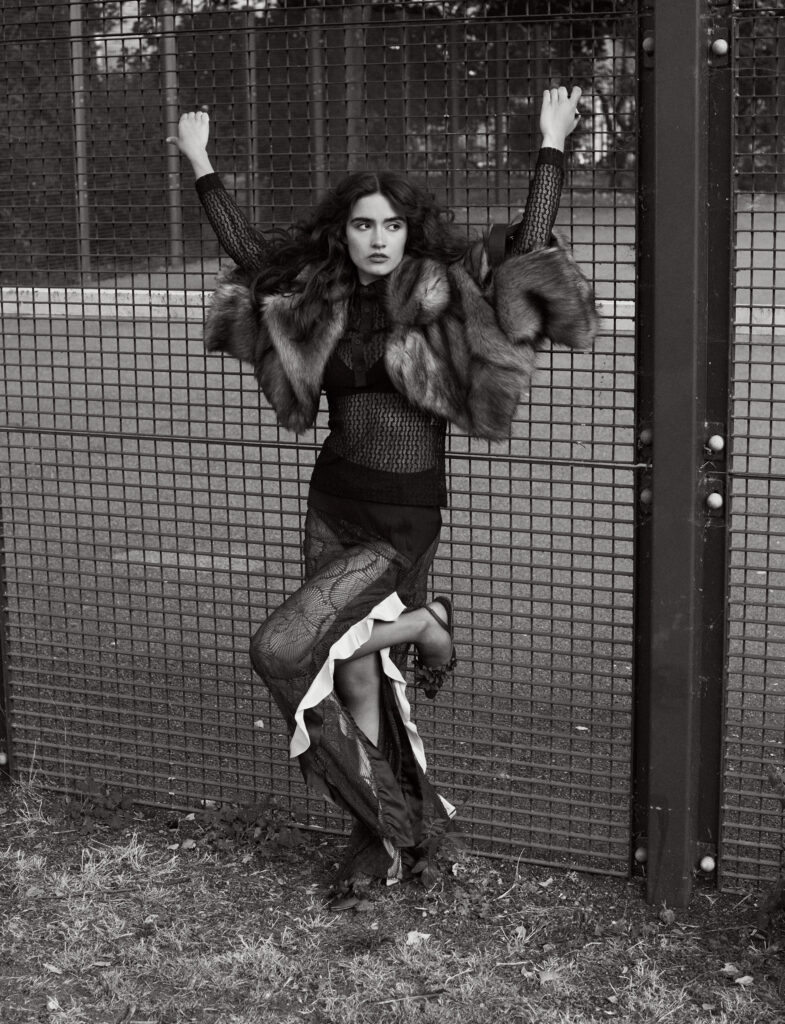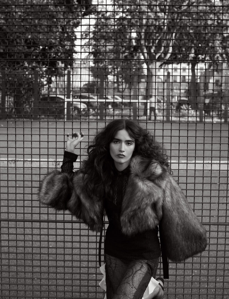 Knit top, skirt, & faux fur coat: Toga, under top & briefs: Florentina Leitner, heels: Manolo Blahnik