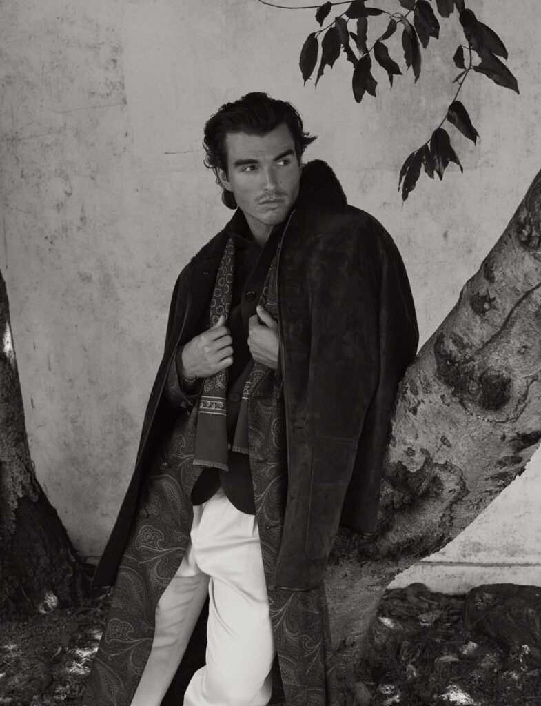 Shirt/Jacket: Wear London, Silk Jacket, Trousers & Shearling Coat: DUNHILL, Boots: Manolo Blahnik