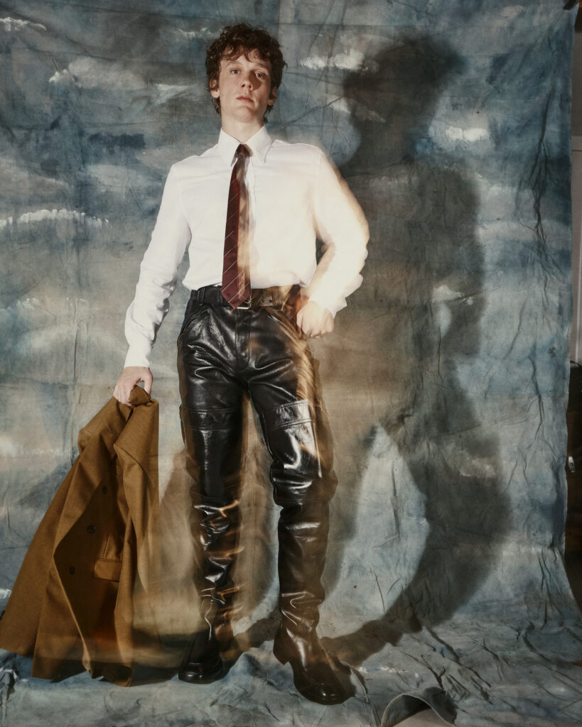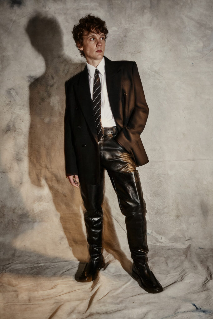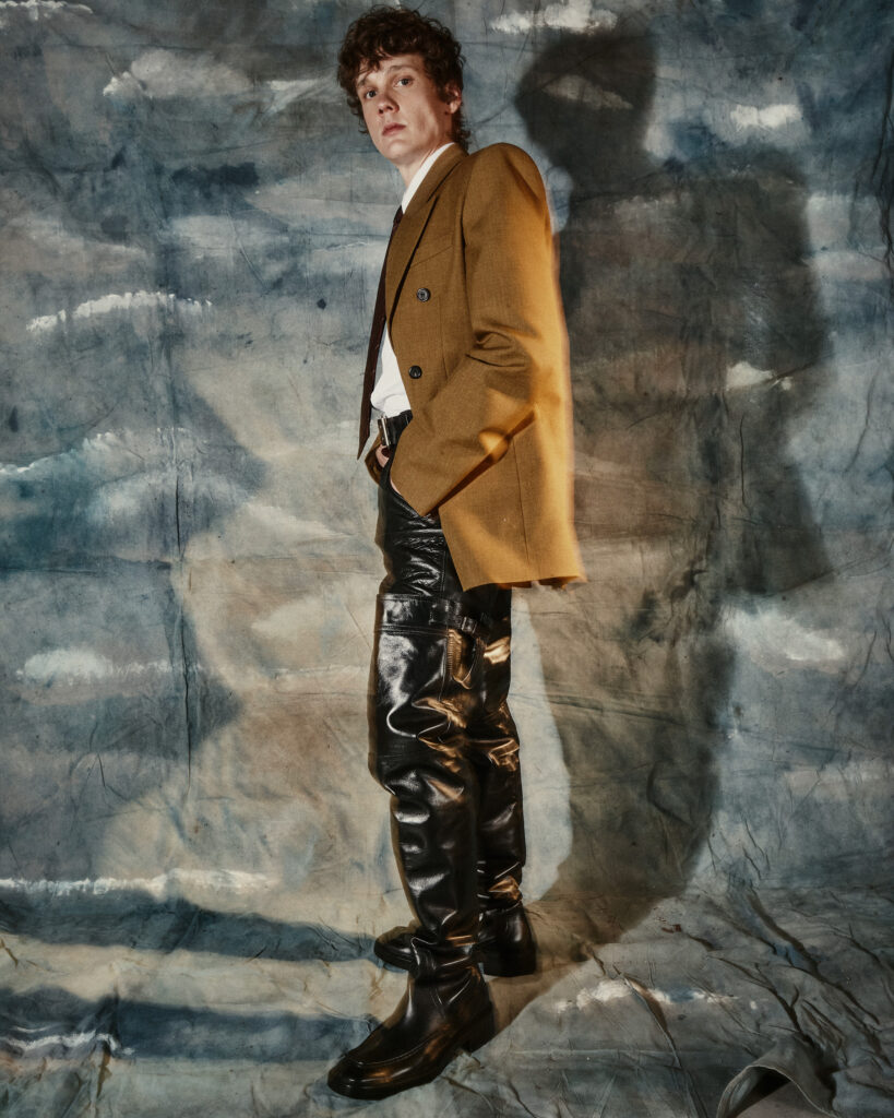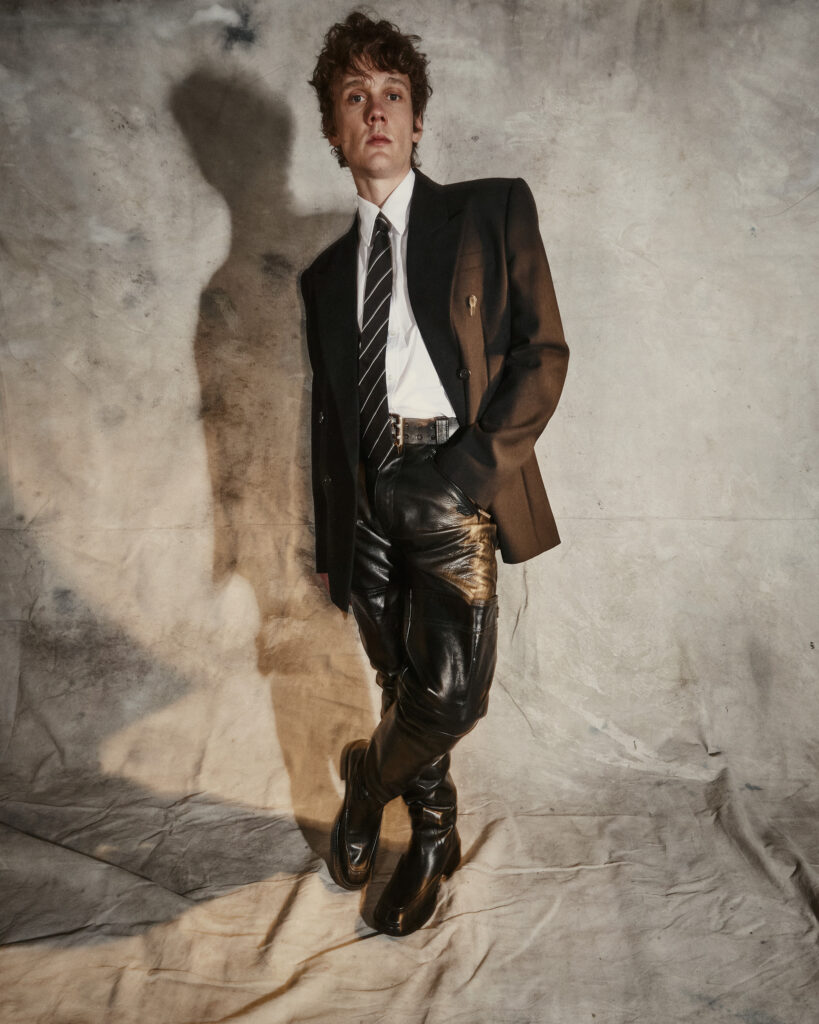 Suit Jacket, Leather Pants, Shirt, Tie, Belt, & Boots: Saint Laurent F25, Ring: Pyrrha