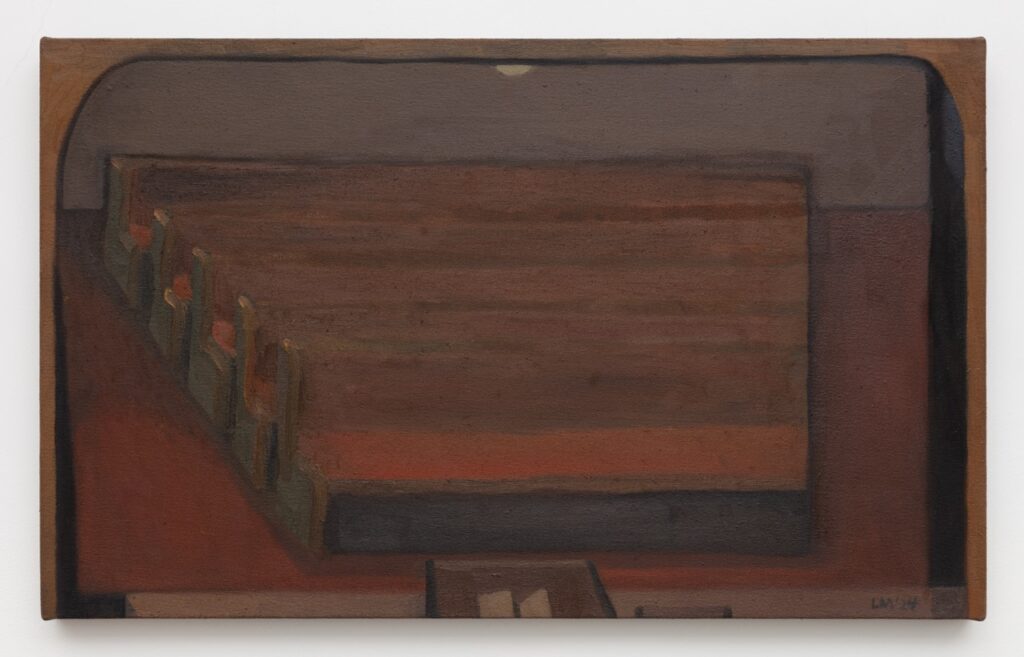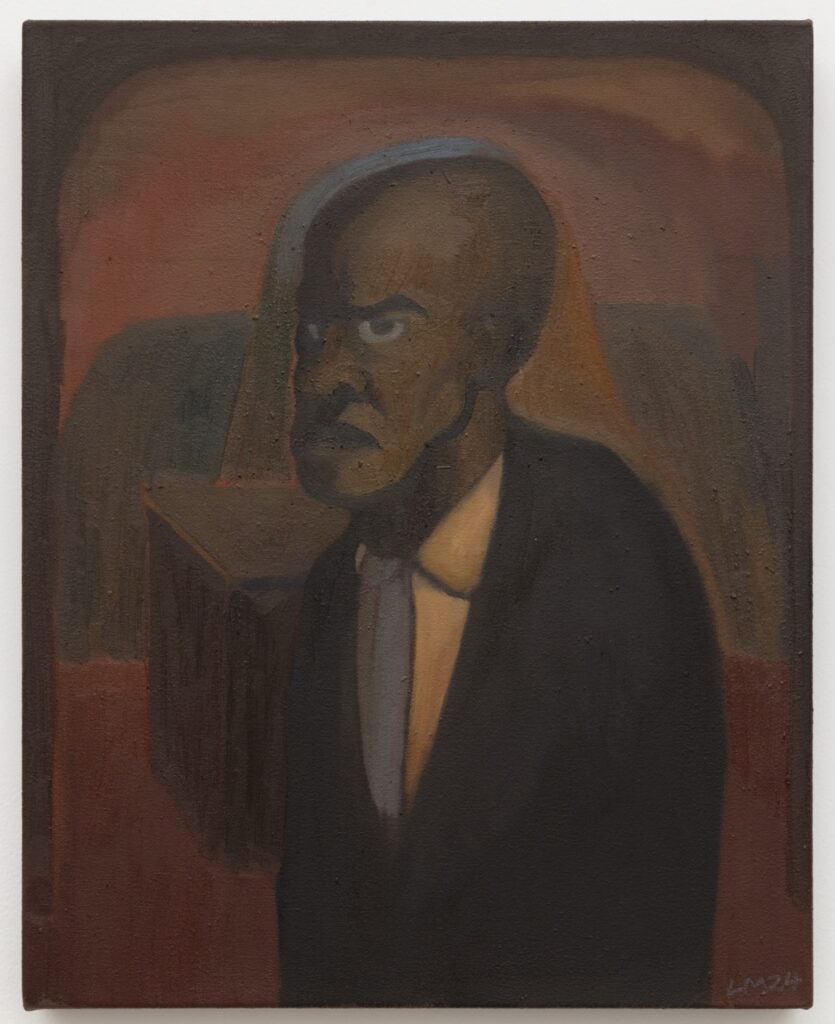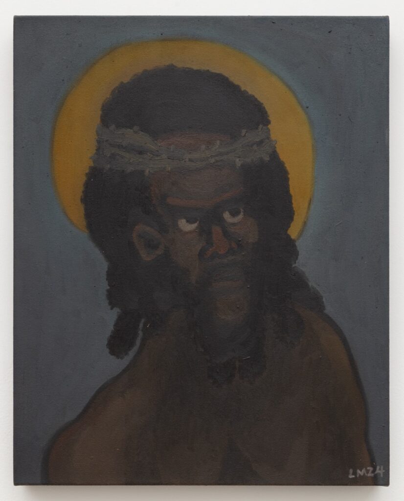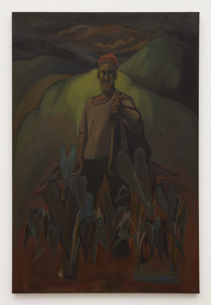Lenworth McIntosh creates semi-autobiographical paintings that capture identity-shaping moments, often set against the shifting light of dawn and dusk. This latest series revisits the landscapes of his childhood in Jamaica’s lush interior, offering a reflective journey through memory. Towering figures represent the influential adults in his life—his devoted, churchgoing grandparents dressed in their Sunday best, while casually dressed community members linger outside a local shop on a weeknight, greeting one another and engaging in quiet acts of collective care. A young boy, moving through these scenes, looks up at the adults around him, unquestioning of the world’s unspoken rules.