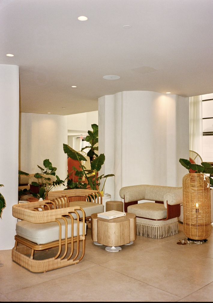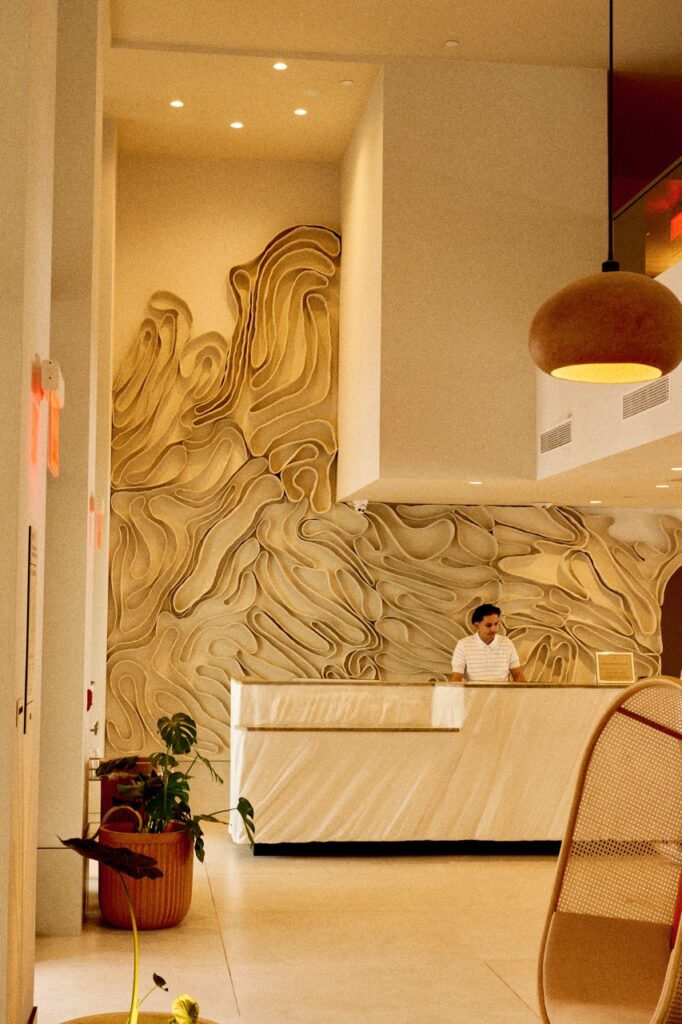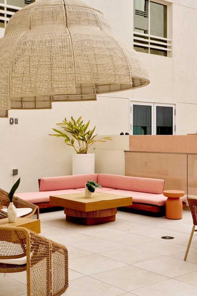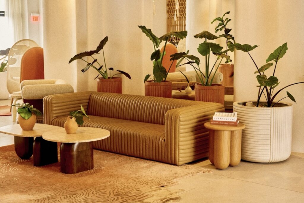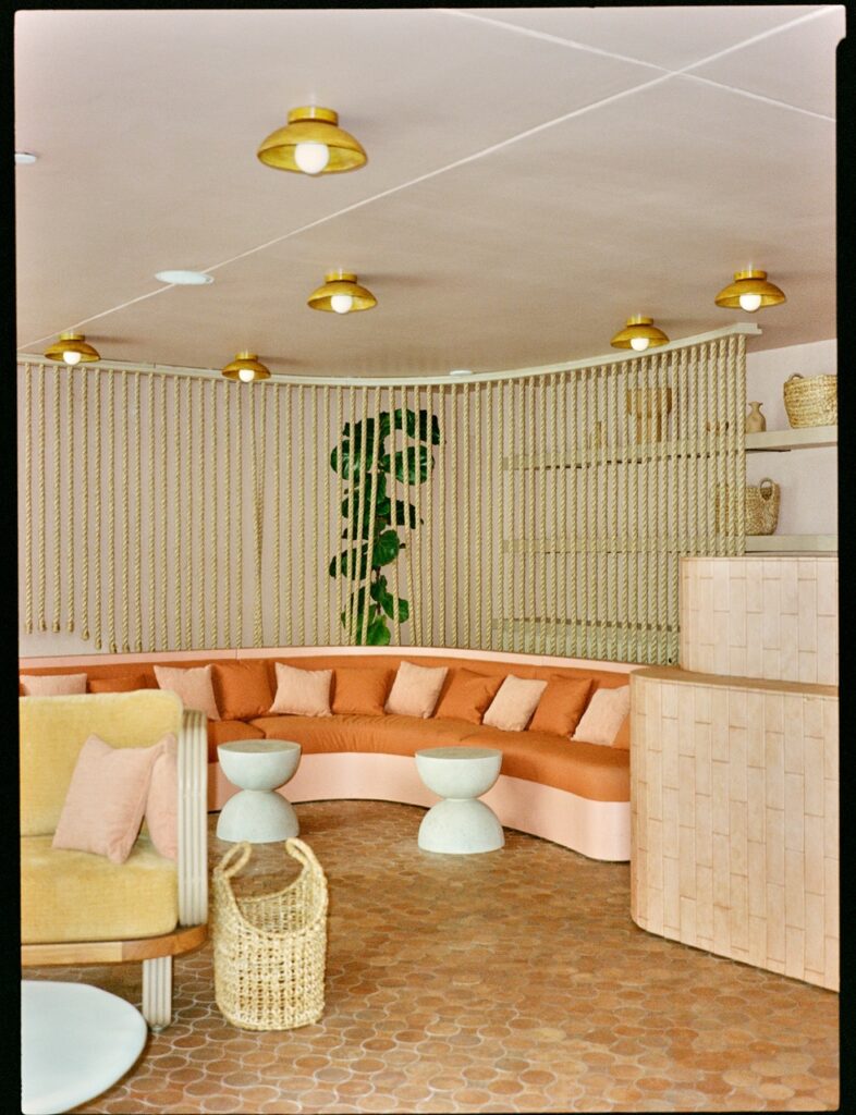 We used my lighting collection, made in collaboration with L’Aviva Home—ceramic pendants handcrafted in Oaxaca, Mexico, featured at the Marelle restaurant. The art was curated globally by Louis’Dimension Gallery. Zia Tile provided handmade tiles from LA. All the ceramic accessories are by Dumae, crafted in downtown LA. We designed the custom rugs with Ariana Rugs, and wall coverings were sourced from ARTE. One of my favorite elements, though, is invisible—you smell it before you see anything. We created a custom scent for the hotel in collaboration with Bio Alchemy Olfactive. Now, when you walk in, that scent immediately immerses you.