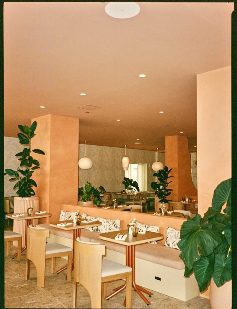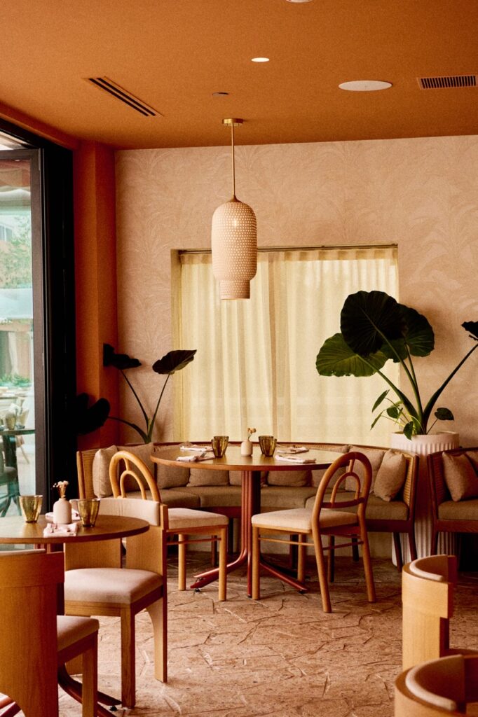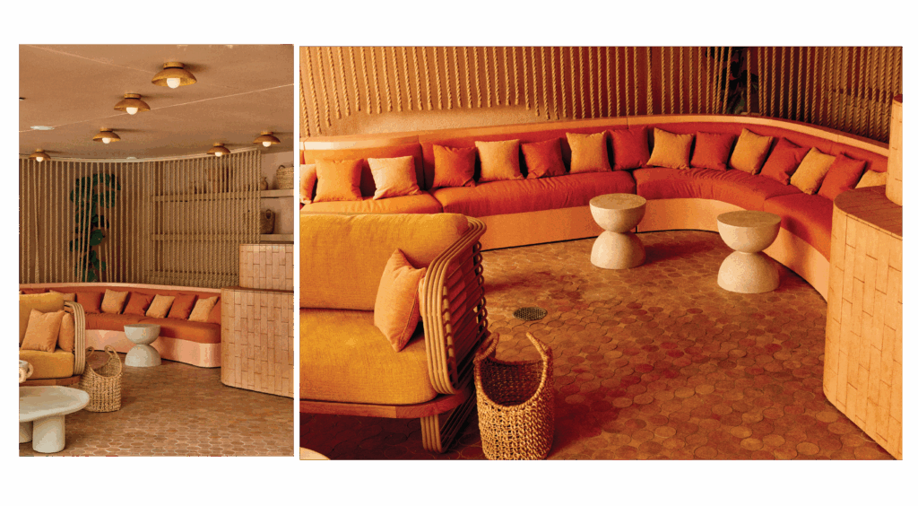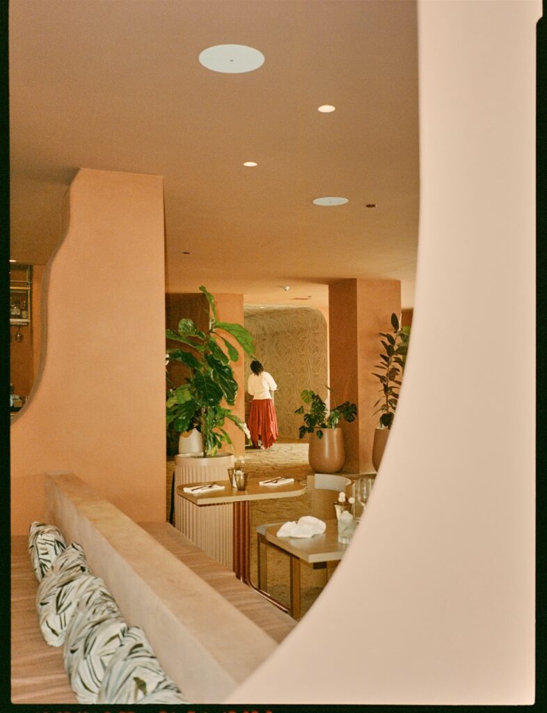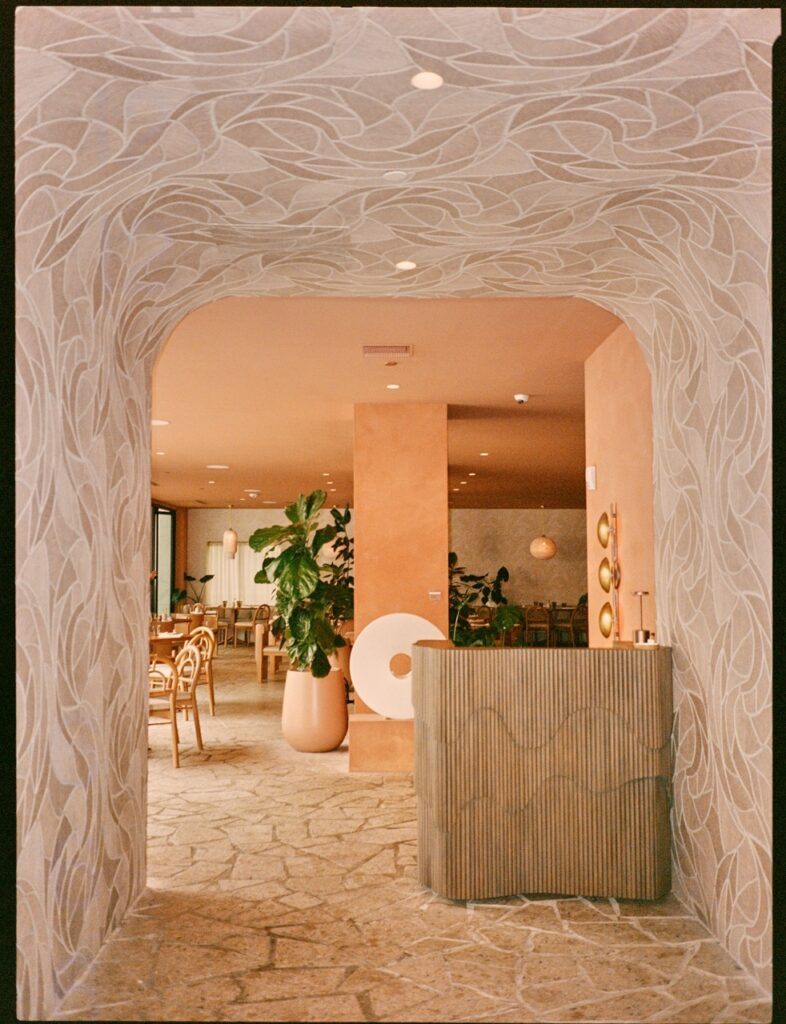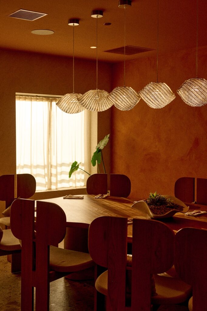 The sunset colors of Santa Monica Beach set the tone. We created a warm glow through terracotta plaster on the walls and ceilings, evoking a Mediterranean spirit with relaxed elegance. I wanted guests to feel that breezy joy of a European beach restaurant. And then… we added a golden banana leaf-speakeasy lounge for late-night conversations. It’s intimate, sexy, and tucked away beside the bar.