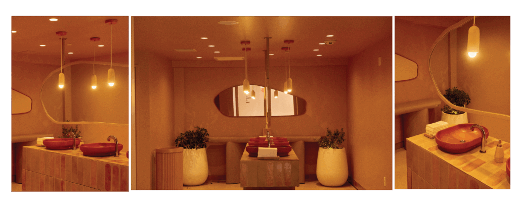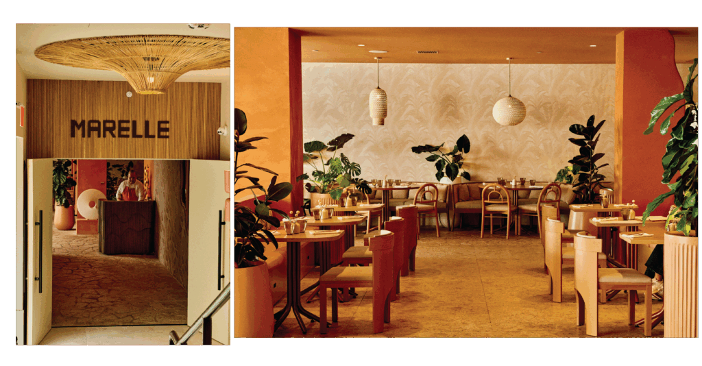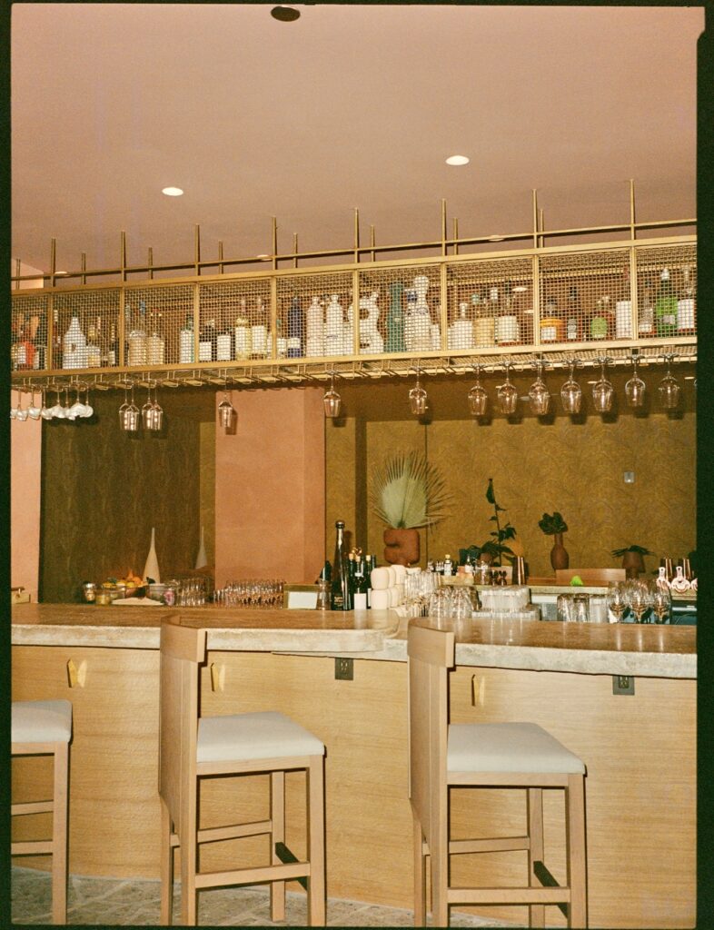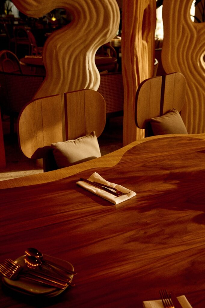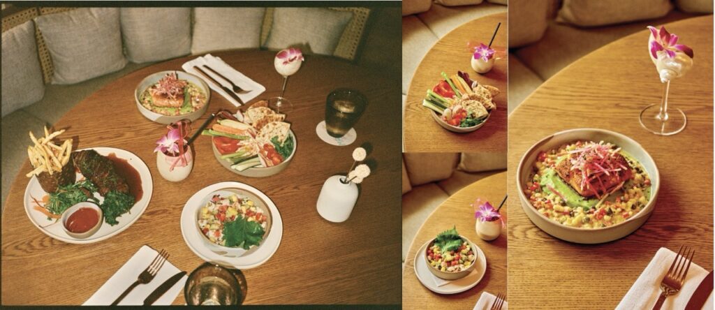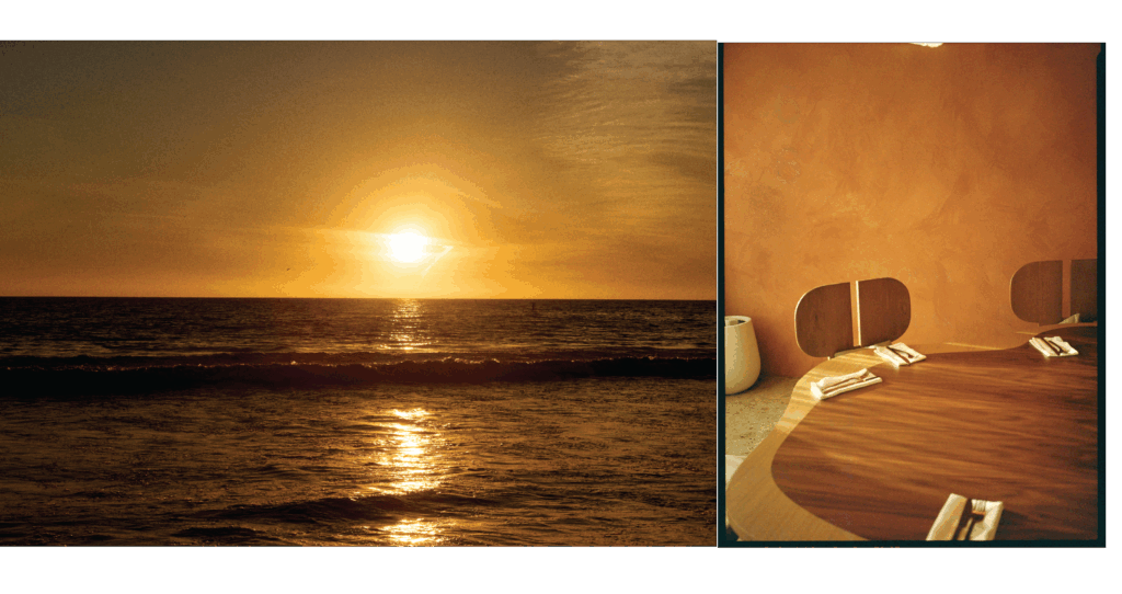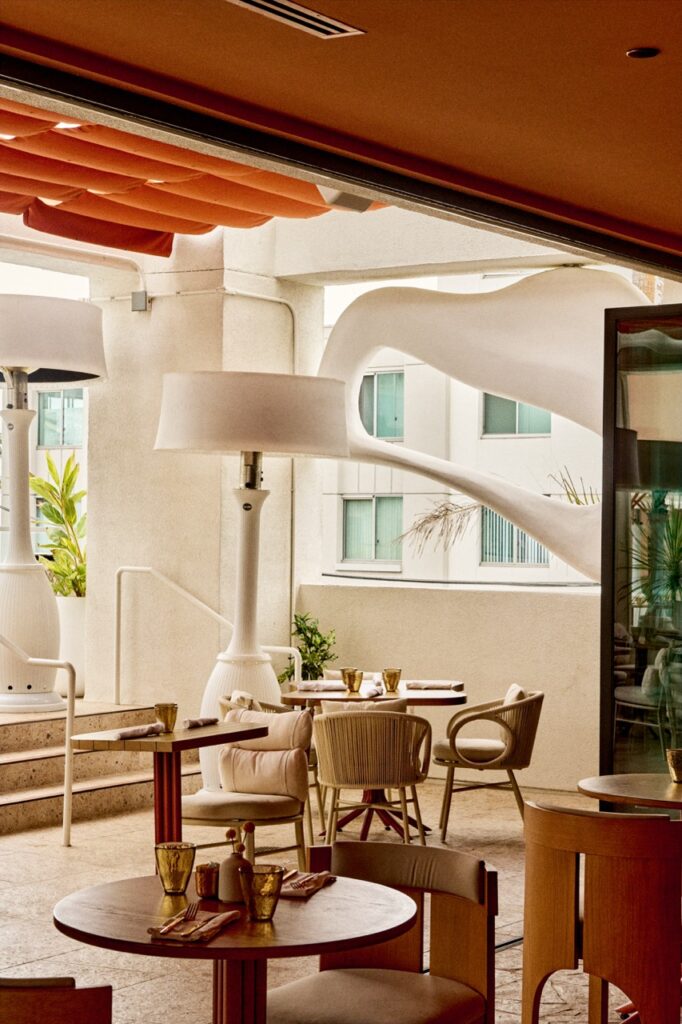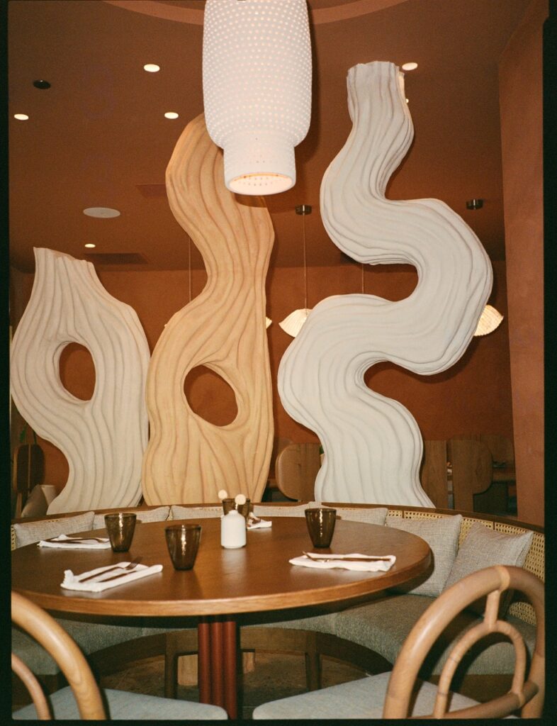 The sunset colors of Santa Monica Beach set the tone. We created a warm glow through terracotta plaster on the walls and ceilings, evoking a Mediterranean spirit with relaxed elegance. I wanted guests to feel that breezy joy of a European beach restaurant. And then… we added a golden banana leaf-speakeasy lounge for late-night conversations. It’s intimate, sexy, and tucked away beside the bar.