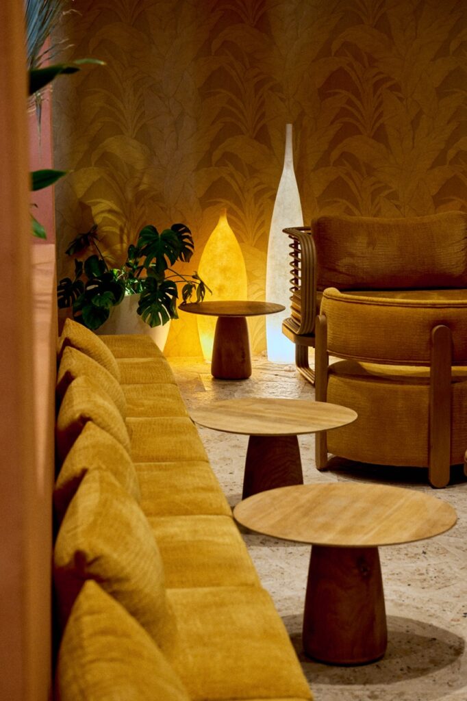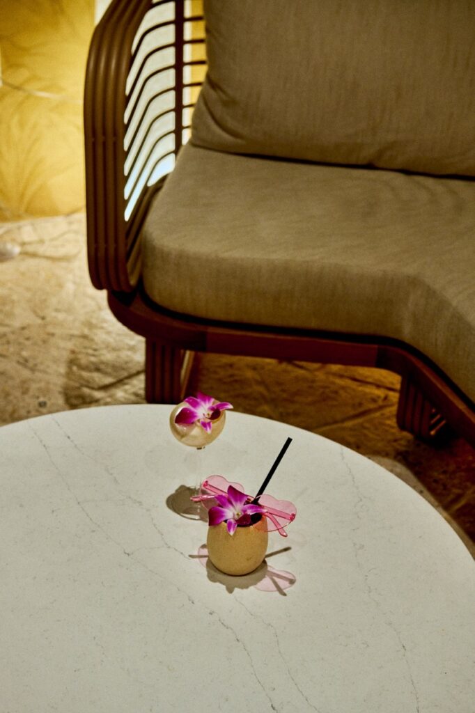 Behind the restaurant’s bar, a golden banana-leaf–clad speakeasy lounge adds a whisper of glamour and intrigue. This jewel-toned space, tucked away just off the main dining room, is designed for late-night conversations, after-dinner drinks, and moments that feel deliciously off-script. It’s a nod to European nightlife—elegant, sultry, and a little unexpected.