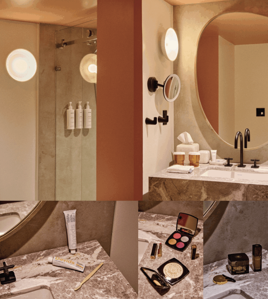Guest rooms continue the design narrative with sculptural precision and effortless luxury. A mid-sized suite, for example, offers a generous lounge area, a bed that feels like a private cloud, and a bathroom that could easily double as a spa. The walk-in shower, expansive vanity, and ambient lighting create a space that soothes as much as it stuns. Thoughtful gestures—macarons, fresh flowers, mineral water in glass bottles—punctuate the guest experience with care and refinement.
